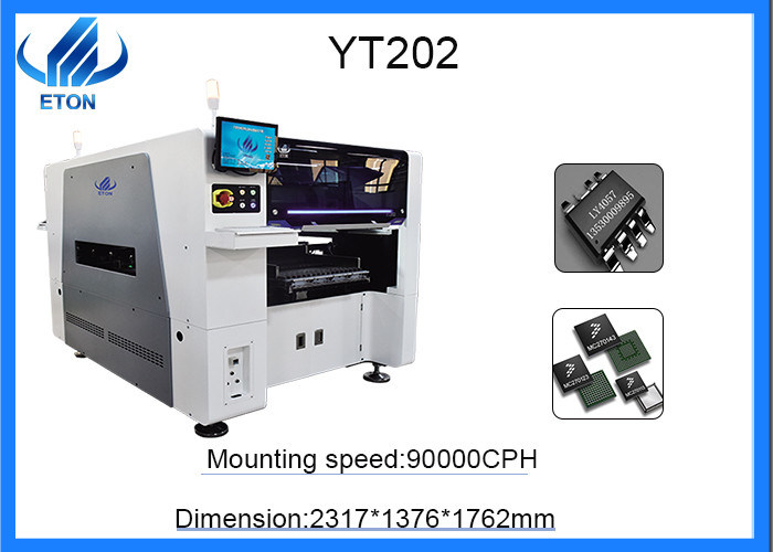 YT 202 es uno de los productos nuevamente lanzados de la serie de YT de ETON. La máquina de la colocación del dual-módulo puede producir dos tableros idénticos del PWB al mismo tiempo, mejorando eficacia de la producción. Bajo condiciones óptimas, la capacidad de producción puede alcanzar 90000CPH, y la precisión está muy arriba, y los componentes montados mínimos pueden alcanzar 0201.