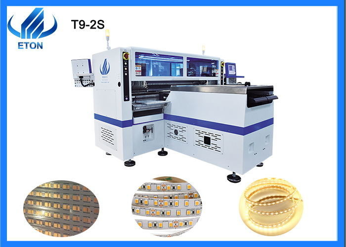 El T9-2S es la última pista dual de ETON, sistema dual, máquina de montaje ultra de alta velocidad para producir las lámparas suaves sin plomo del LED. Se equipa de una cabeza de montaje ajustable integrada de alta velocidad desarrollada independientemente por ETON, y la correa de las ayudas montó el LED, 3014, 3020, 2835, 5050, o los resistores, los condensadores, los puentes, etc. Bajo condiciones óptimas, la capacidad de producción puede alcanzar 500000 CPH.